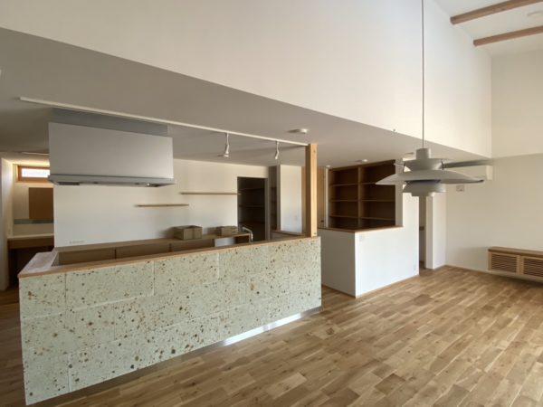 大谷石の腰壁キッチンが良い感じです