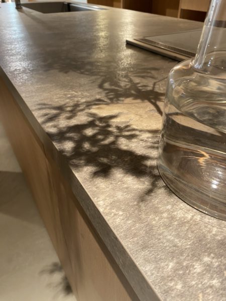 キッチンの天板に映った植栽の影が、