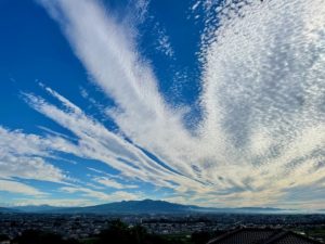 窓から空を見ると放射状のうろこ雲。